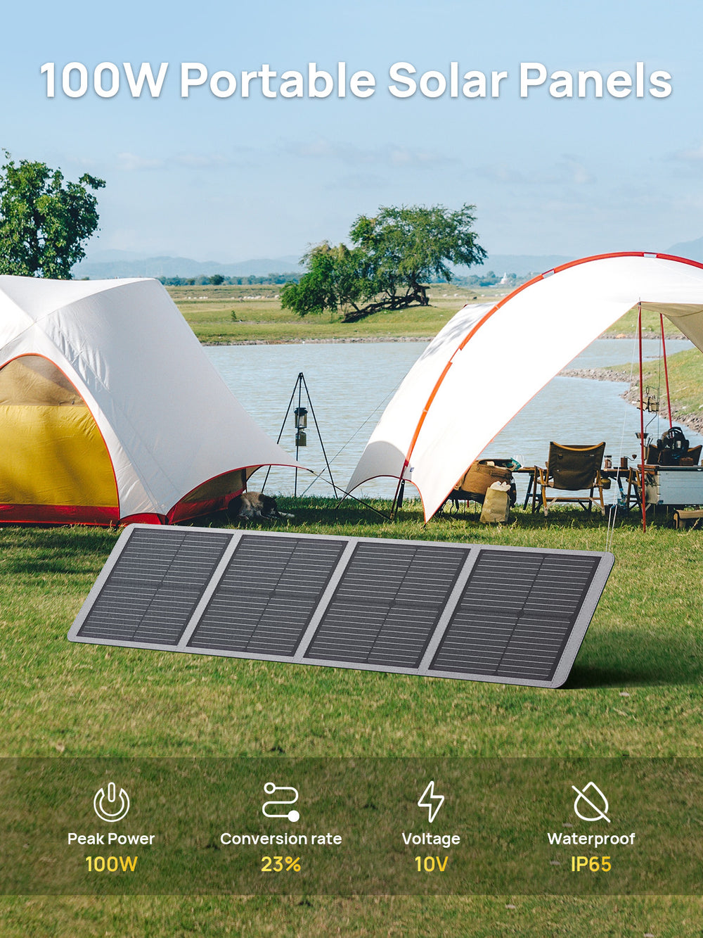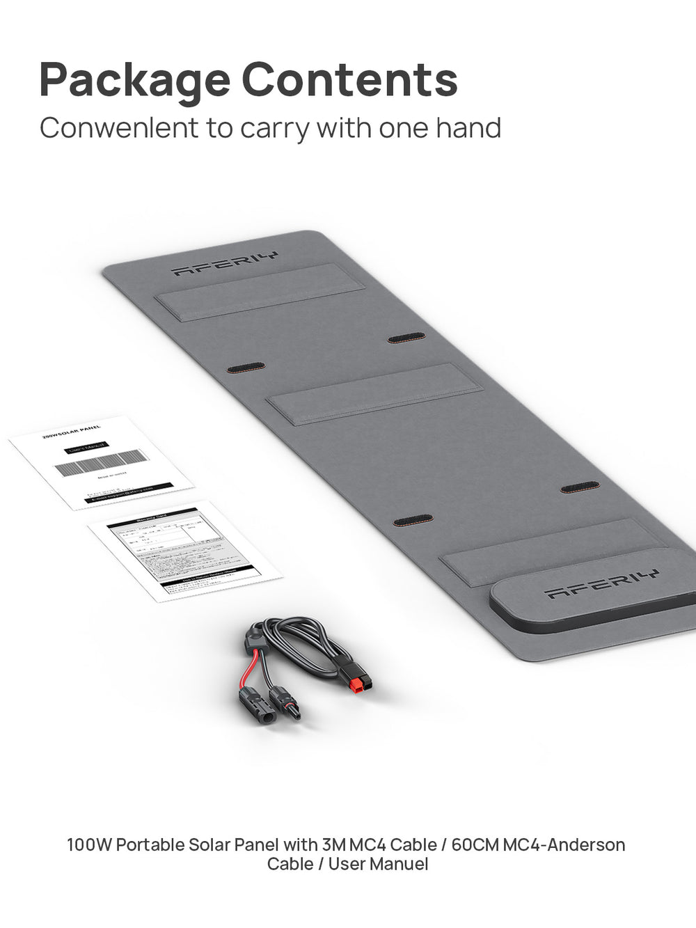 Pannello solare portatile AFERIY S100 100W che utilizza pannelli solari monocristallini di grado A+. Converte direttamente la luce solare in energia elettrica e l'efficienza di conversione energetica può raggiungere il 23%. Leggero, pieghevole, portatile e impermeabile IP65, il pannello solare AFERIY consente di produrre facilmente energia pulita e rinnovabile per la tua casa o il tuo campeggio all'aperto e di assumere il controllo del tuo consumo energetico.