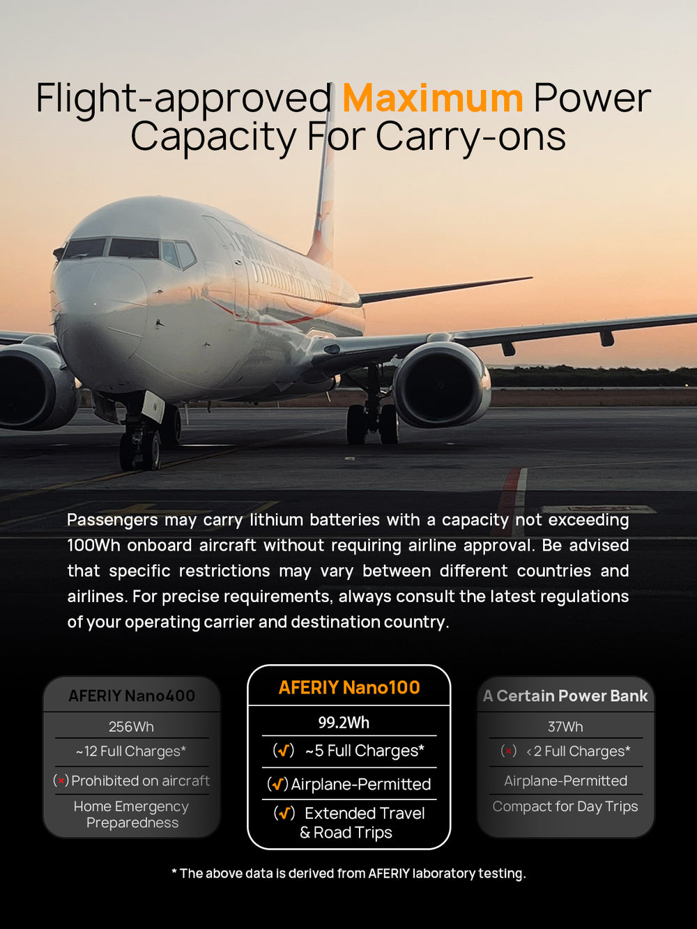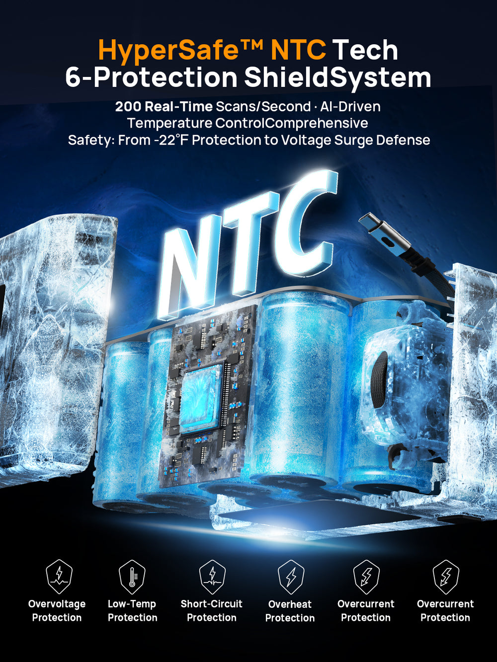 La stazione di ricarica portatile AFERIY Nano100 da 100 W integra la tecnologia NTC e una protezione 6 in 1 per evitare sovratensioni, sovraccarichi, surriscaldamenti, cortocircuiti, ecc. Sicurezza termica intelligente per una batteria LiFePO4 durevole, ideale in viaggio o in aereo.