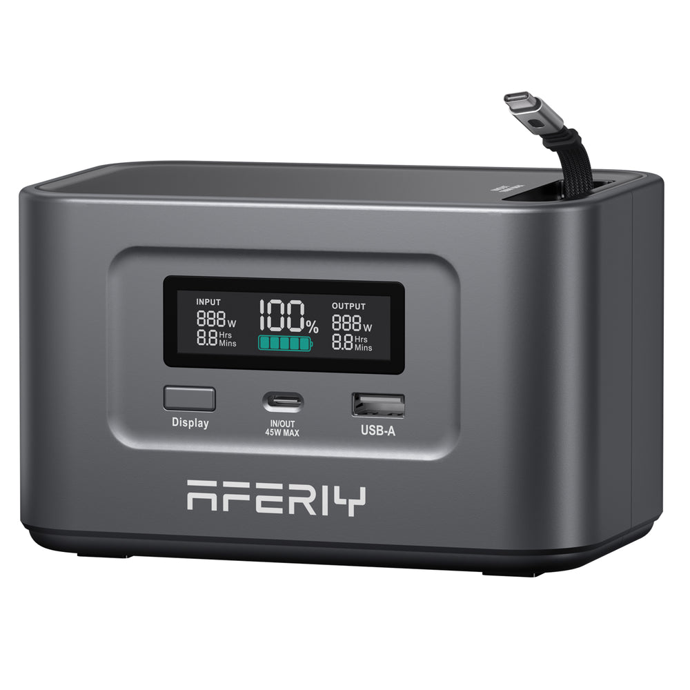 AFERIY Nano100 Power Bank LiFePO4 100W dispone di 2 porte USB-C 145W (100W + 45W, ingresso/uscita) e 1 porta USB-A. Può ricaricare rapidamente più dispositivi contemporaneamente: smartphone, tablet, auricolari, droni, Nintendo Switch, ecc.