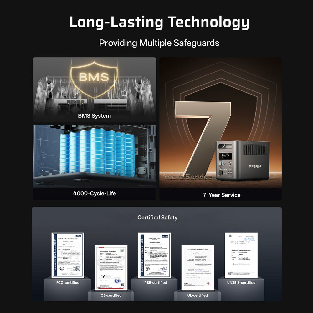 Certificazione UL, CE, FCC, RoHS, TELEC. La confezione include la stazione di alimentazione portatile AFERIY AF-P180, un cavo di ricarica CA, un cavo MC4-XT60, un manuale utente, una custodia antipolvere e una custodia.