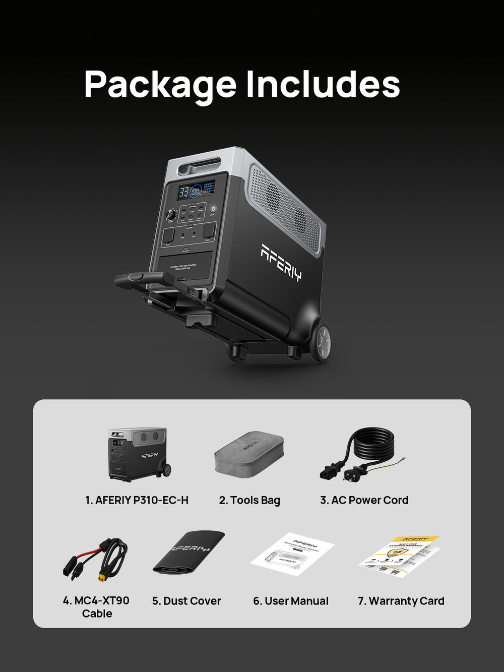 Approfitta di una garanzia estesa di 7 anni dalla data di acquisto e di assistenza tecnica a vita. Certificato UL, CE, FCC, RoHS, TELEC. Il contenuto della confezione include la stazione elettrica portatile AFERIY AF-P310, un cavo di ricarica CA, un cavo MC4-XT90, un manuale d'uso, una custodia antipolvere e una borsa per riporla.